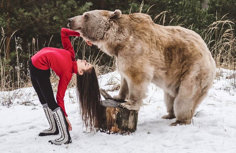 Според Олга Баранцева мечката е изненадваща за всички фотографи, изобщо не беше агресивен, но много мил и мил. Той не само се радваше да изпълнява акробатични упражнения със Стефани номера (играеше заедно с нея), но и с не по-малко вълнение той яде плодове, предложена му от приятелката му, защо стрелбата беше забавна и забавно. И въпреки че първоначално с повишено внимание участниците в тази сесия заснеха дива мечка, в крайна сметка всичките им страхове и съмнения, как казват, просто изчезнали, оставяйки усещане за настоящето празник – наближаващата Нова година.
