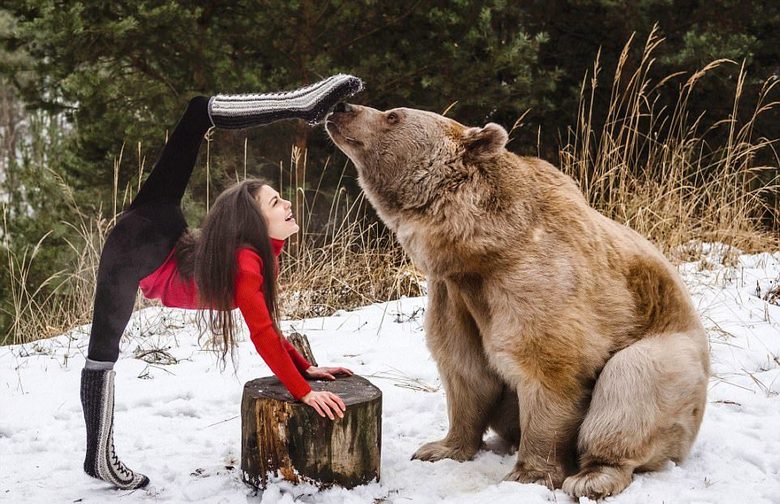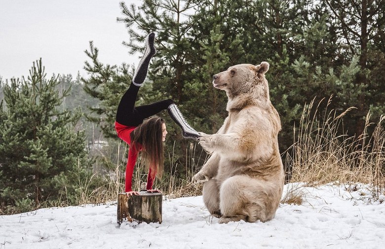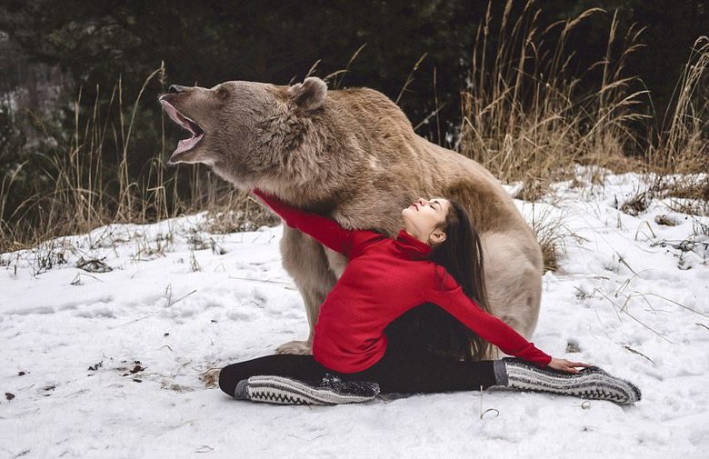 Приготви се известният австралийски акробат Стефани Милинджър за интернет потребителите прекрасна сесия за Нова година, където тя показва не само своята неразбираема за обикновения човек гъвкавост на тялото, но и още по-фантастична функция – истинско приятелство и партньорство в тяхната акробатична практика с дива кафява мечка.