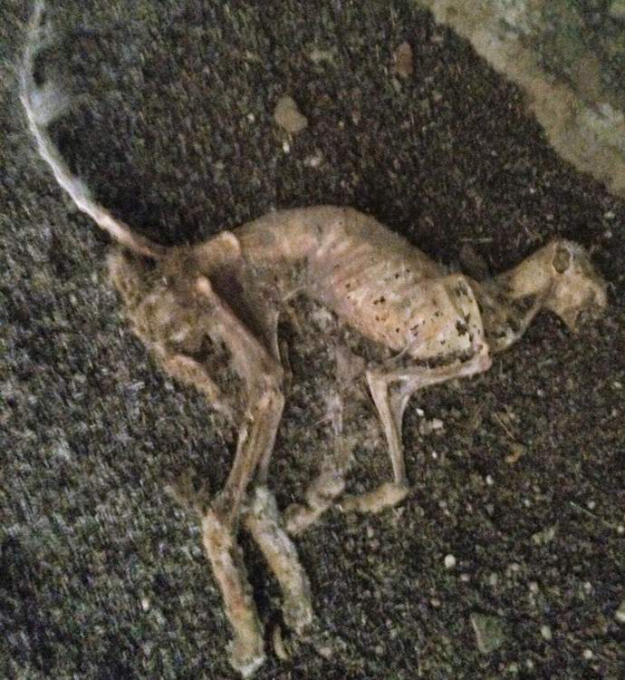 Американец казва: „Реших да отстъпя малко от известните ме пътеки и проучване на места, където не съм бил преди. Изключване с от предвидената пътека, изминах около километър и се натъкнах малка пещера с мумифицирани останки определено същество. Той лежеше в един ъгъл в един от далечните клонове. Имаше дълги задни крака и сравнително къса предна, както и дълга опашка. Главата е донякъде подобна. по котешки, но определено не е котка. Животното е сравнително малко, но много свиреп на външен вид. Може би това е чубакабра, не възрастен “.