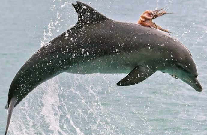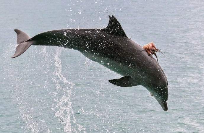 В австралийския град Порт Маквари на местния фотограф Джоди Лоу успя да улови рядък момент в три снимки – на гърба Делфинът, който скача от водата, беше октопод отзад на делфин.
