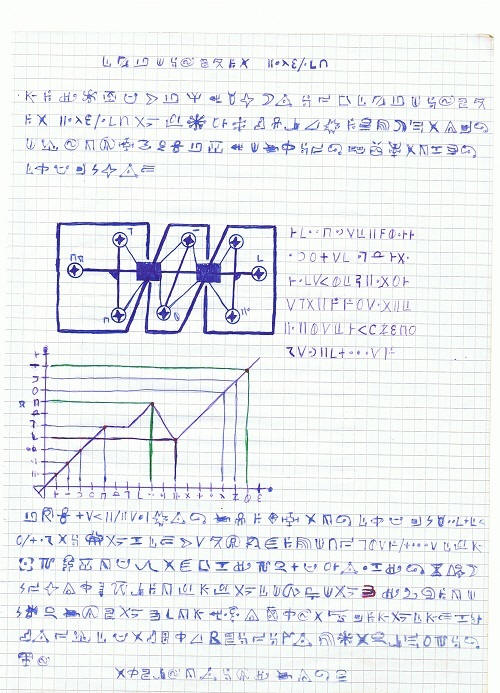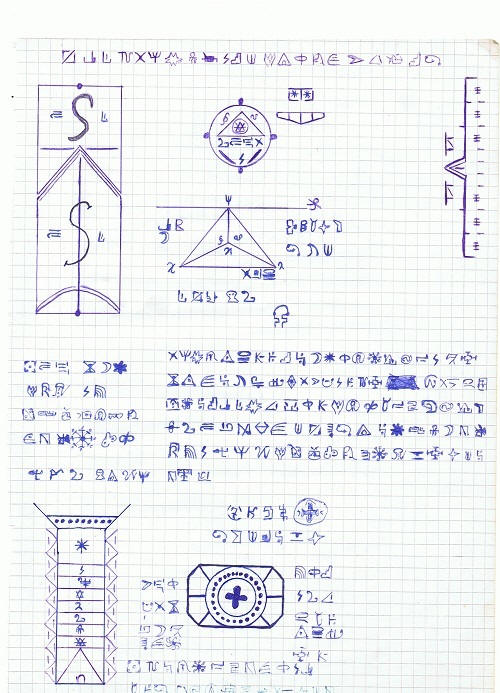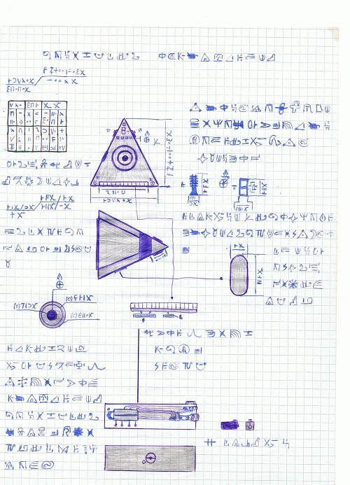 Странни рисунки, по-подобни на чертежи. Свободното пространство на хартия беше заето от непонятни икони. Рисунките оставиха впечатление за нещо смислено, очевидно имащо отношение към науката или технологиите. Авторът написа, че тези рисунки той вече е цяла купчина.