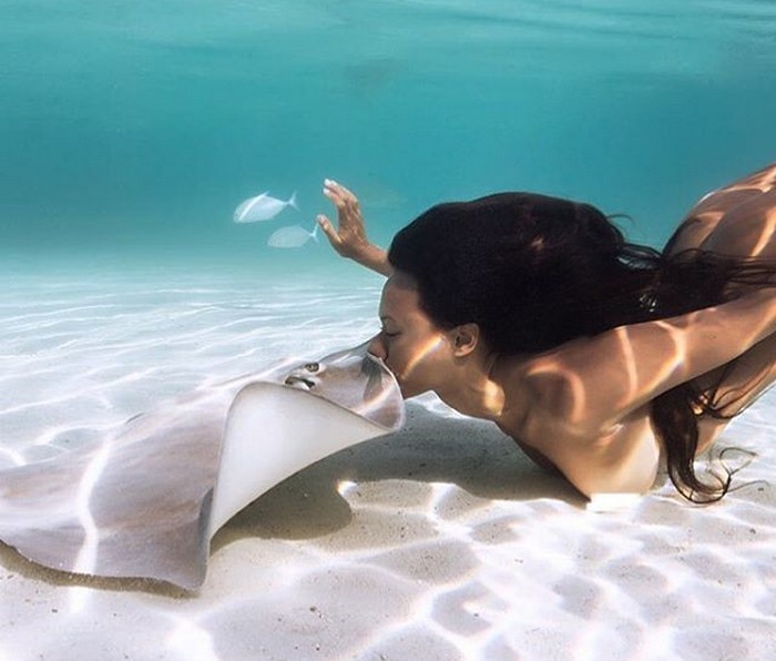 И тук е двадесет и седем годишният остров Rava Ray, модел и хавайски дизайнер просто обича да плува сред опасни ужилвания и не по-малко ужасни акули. Разбира се, тя не е против галено с безобидни костенурки или сладки делфини, тя обаче не вижда голяма разлика с кого трябва да плува и се гмуркайте.