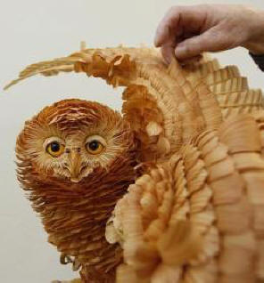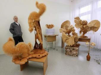 Сергей Бобков, учител в средното училище в село Кожан Красноярска територия, стърготини дори могат да изобразяват вълна или пух кукумявка.