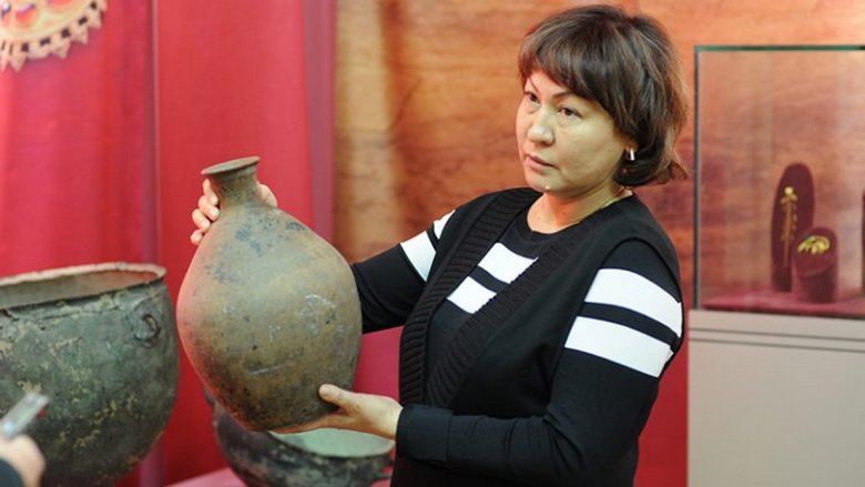 Неканеният гост обаче се оказа още по-фантастичен. дар на съдбата – древен съд. Как да създадем по-късно музей експерти, тази антична кана е направена от согдийски майстор майстор, живеещ в Тараз около IX век. В такива съдове, обяснява изследовател в музея Галия Алимжанова (на снимка), предците на съвременните казахи съхранявали млечни продукти, вино, сокове и със сигурност поддържат чиста изворна вода в тях. взривове стомна, открита от Андрей Германович от факта, че той на практика “нов”, перфектно запазен за повече от хиляда години. Оказва се че древните грънчари от Тараз са притежавали тайната на подбора на състава от глина и стрелба, която с времето се губеше. В крайна сметка, модерна керамика изкуството на Казахстан просто не може да даде нещо подобно здравина и издръжливост на керамичните изделия.