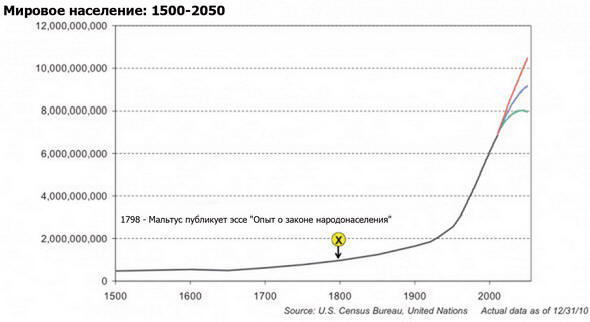 – През последните 200 години световното население се взриви – как и предсказа Малтус. Това, което той не можеше да предвиди, е открития на нефт и други природни ресурси, които биха могли (временно) подкрепят експлозията на населението. Тези ресурси сега намаляват …