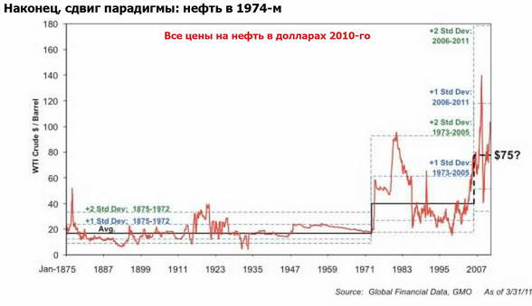 – Вземете например петрола … петролът се търгуваше приблизително 16 долара за барел за сто години. Тогава, когато търсенето надхвърли предлагането, парадигмата се измести – до около 35 долара за барел. Сега, смята Грантъм, парадигмата се измести отново до средно около 75 долара за барел.