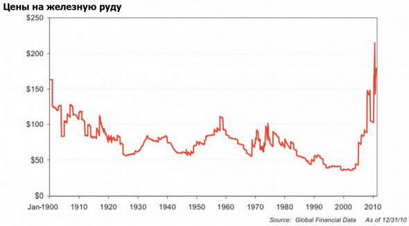 – И не само петролът преживява промяна в ценовата парадигма. Цената на металите също рязко се повиши. Например 100-годишен преглед на цената на желязна руда