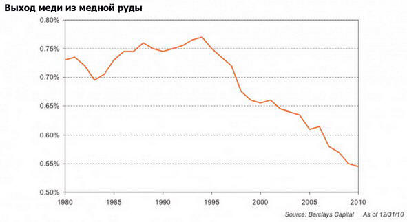 – Историята с металите е същата като с маслото: всичко вече се берат ниско висящи плодове. Въпреки използването на нови технология, производството на тон метална руда продължава да пада. Тук да например, продукция на тон медна руда: