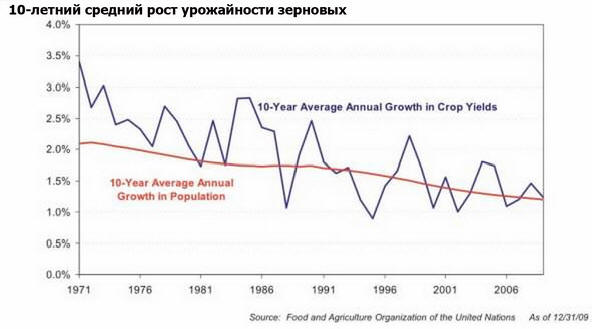 * Сега, въпреки значително увеличение на употребата торове, ръстът на добива на хектар намалява от 3,5 през 1960 г. до 1,2 процента в момента. Остава малко свободна земя които биха могли да участват и като хора ставайки по-богати, те ядат все повече месо, хранено със зърно. Тъй като населението продължава да нараства над един процент, запасите остава малко сила.