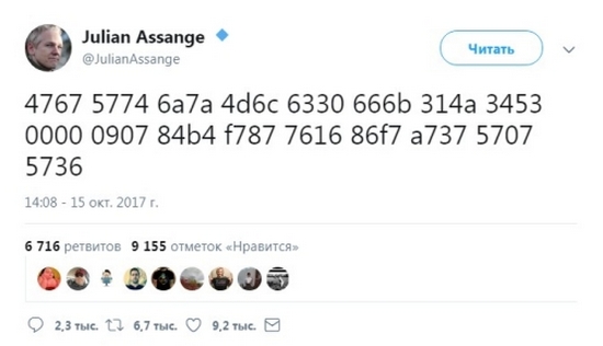 Австралийски онлайн журналист Джулиан Асандж (Julian Асанж), основател на WikiLeaks и световноизвестен привърженик на теорията световна конспирация, криейки се в продължение на пет години от силите, които са това в посолството на Еквадор в Лондон, публикувано вчера на неговото страницата в Twitter е много загадъчно съобщение, ясно криптирано, което буквално шокира всички теоретици на конспирацията.