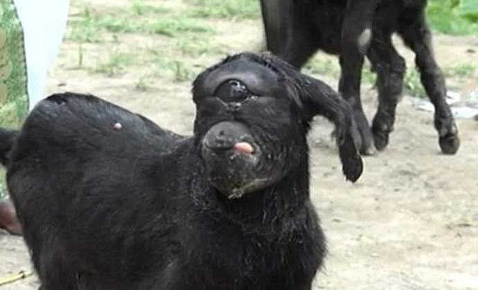 В индийското село Асам се роди необикновено дете с с едно око. Според ветеринари, малчуганът не е трябвало да живее и няколко дни, тъй като животни с подобен дефект в развитието умират почти веднага след раждането. Това обаче циклопи измами всички очаквания на лекарите и живя повече от седмица. В момента време той бяга с други животни във фермата и води нормално за добитък.
