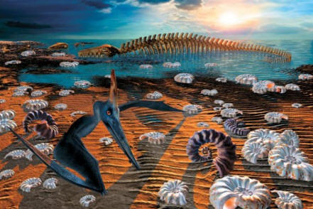 снимка от открити източници Намерени са кратери и специални скали в района на полуостров Юкатан, на територията на съвременно Мексико, показват, че там е паднал астероид. Падението му предизвика катастрофални последици: взривна вълна изгори почти всички живи същества в околността и чудовищно цунами опустоши крайбрежието. Най- ълната продължи бряг на морския живот като скрит в спирала Амонитни мекотели и морски гущери – мосазаври. Техните останки се оказа на километри от водата и служи като храна за рядко оцелели сухоземни жители. При удряне на земята астероидът се изпарява и изби от кратера смес от прах, пепел, разяждащи пари, които, издигайки се в атмосферата, отрови я и затъмни слънцето. рязък охлаждането и киселинният дъжд вероятно продължиха няколко години. Така е събитието беше придружено от изчезването на 35% от видовете морски обитатели и също всички големи влечуги: морски динозаври, динозаври и птерозаври. Фиг. Олга Орехова-Соколова