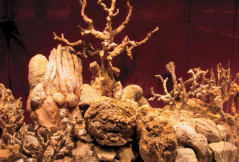 Кредово морско дъно, преди да е празно 65 преди милиони години. Отляво са черупките на молюскорудистите, “динозаври на моретата”, наречени така заради големите си размери и едновременно изчезване. Диорамата е направена от истински палеонтологични обекти, негов автор е Сантяго Лафарга. Вижте: АНДРЕЙ ЖУРАВЛЕВ