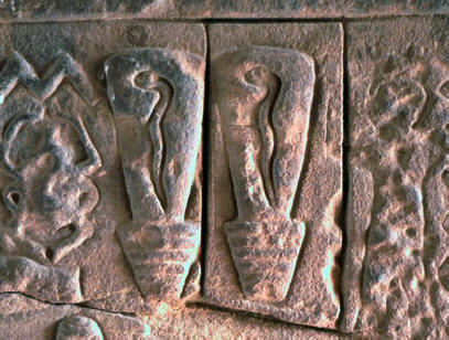 Тези колби или мехурчета много приличат на гигантски електрически крушки с фантазия витаещи змии вътре. Змийски глави се увенчаха цветя на лотос, донякъде напомнящи държачите на лампи. нещо подобно на кабел, свързан към кутия близо до символът на силата е „единият стълб“, също свързан със змии.