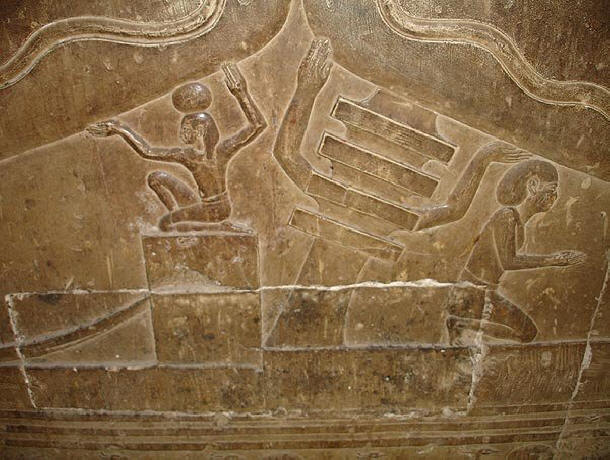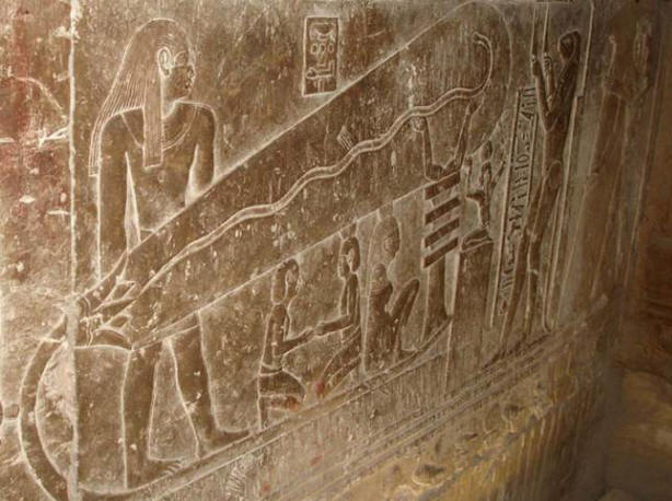 Има критични причини, защото изображението е придружено само йероглифи на някакъв религиозен химн, посветен на бога на слънцето – Pa. Това позволи на египтолозите да изпуснат всички неформални хипотези и уверено обяснете пиктограмите, изобразяващи храмовата мистерия с небесната лодка на слънчевия бог Ра. Според вярванията на египтяните, слънцето всеки ден умира вечер и се издига призори. Ето го символизира змията, която, както се вярваше в земята на фараоните, преражда се всеки път, когато тя хвърли кожата.