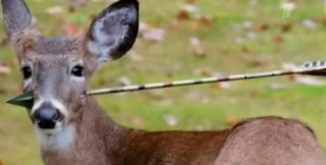 Два пъти щастлива жертва на бракониер в Ню Джърси. мощен стрела с арбалет удари елен, но заседна в главата, не уврежда мозъка и не разрушава нито един голям съд.