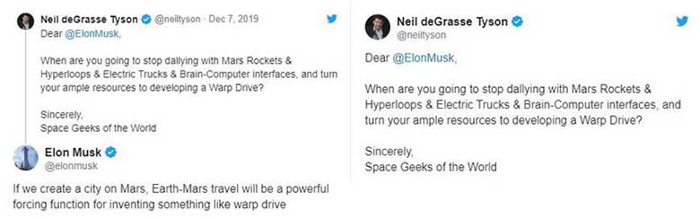 Добре известният астрофизик Нийл де Грас Тайсън (Нийл де Грас Тайсън) призова Елон Мъск да се откаже от обичайното си проекти като SpaceX, Tesla и започнете да създавате warp задвижване, т.е. междузвезден двигател, който пътува в състояние да развие скоростта на ракетата в космоса, далеч надвишаваща скорост на светлината.