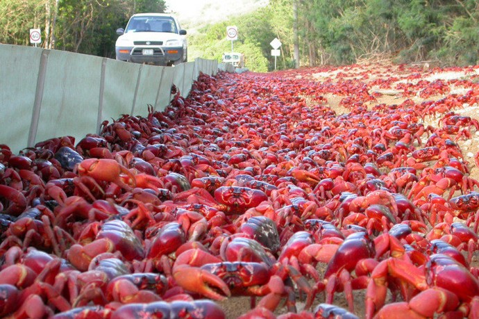 Вижте тази миграция на червени раци. И въпреки че гледката е права приказни, в действителност такива миграции носят много неприятности автомобилисти и пътни служби.