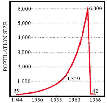 Фигура 4. Промени в броя на елените стада на острова Св. Матей, според проучване на Дейвид K лайн от Университет на Аляска