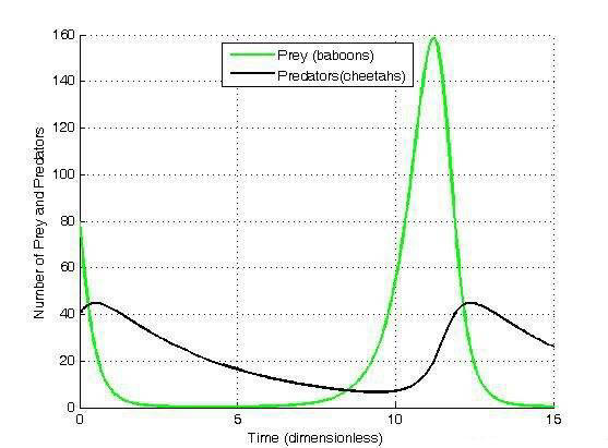 Фигура 3. Тави – модел Volterra, използван за демонстрации на ситуация, започваща с 80 бабуини (зелена линия) и 40 гепарди (черна линия)