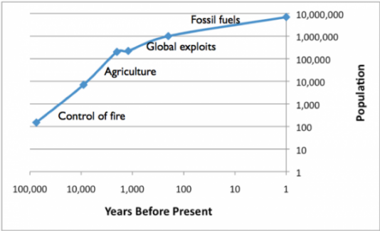 Графика 6. Ръст на човешкото население, докато овладяват ново източници на енергия. Хоризонтален – броят на годините до момента време, вертикала – размер на населението. Отляво надясно: контрол на пожара, земеделие, глобално развитие отлага изкопаеми горива
