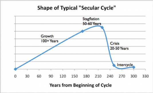 Фигура 7. Типична графика с дълъг цикъл икономическа дейност, изградена според Петър Търкин и Сергей Нефьодов: растеж – 100+ години, стагфлация – 50-60 години, криза – 20-50 години, преходен период