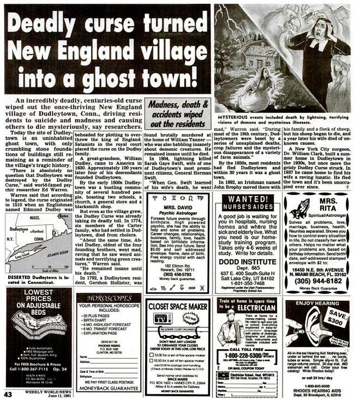 Репортерът на Hartford News Дан Акройд прекара миналия век задълбочено разследване и заключи, че град Дъдлитаун и жителите му просто са били прокълнати, поради което тук се случват всички тези неща мистични смъртни случаи и събития. Джоузеф Дъдли основа този град – един от потомците на херцога на Едмунд Дъдли, който през XVI век се опита да свали крал Хенри VIII. Херцогът платил за това с глава, но царят смяташе, че това не е достатъчно, и той, с помощта на магьосниците проклинаха целия клан Дъдли.