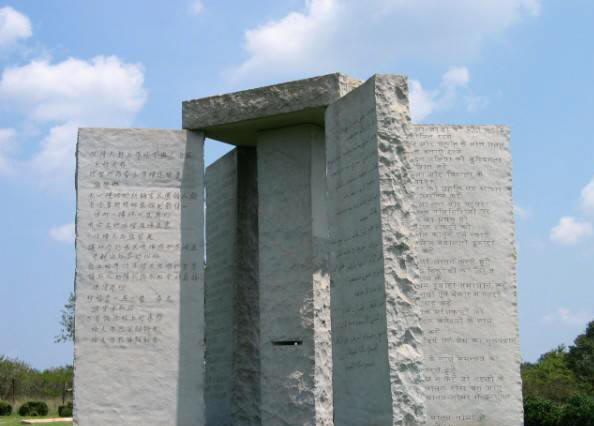 23) Характерно е, че всички тези твърдения съвпадат с първото от “нови 10 заповеди” на грузинските таблети – 6 метра 100-тонен гранитен паметник в графство Алберт, Джорджия, САЩ. Паметникът съдържа дълъг надпис на осем съвременни езика и отгоре на паметника има по-кратък надпис за 4 загинали езика.