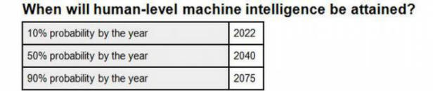 10% смятат, че интелигентността на роботите е равна на човешката причина до 2022 г .; 50% вярват, че това ще се случи през 2040 г., и 90% са съгласни, че роботите ще станат по-умни от хората някъде до 2075 г. година.
