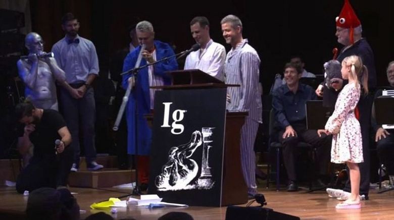 Церемония по награждаването се проведе в Харвардския университет лауреати на Иг Нобеловата награда, която е остроумна в Русия наречена Шнобелевская. Победителите връчиха наградите Нобелови лауреати.
