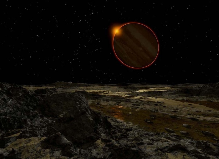 Юпитер е далеч от Слънцето, повече от пет пъти по-далеч от светилото е Земята. Вижте как вече слънчевият диск на спътника на Юпитер – Европа изглежда джудже.