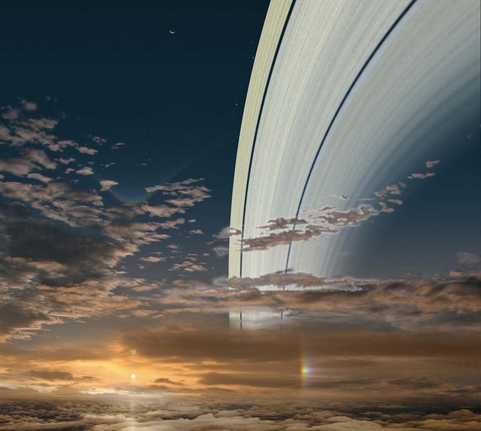 Сатурн със своите пръстени е най-невероятната и мистериозна планета. Слънчевата система обаче е допълнително отстранена от слънцето девет и половина пъти по-далеч от нашата синя планета. Но все още има правилата за сутрешното слънце, особено пречупването в замръзналото кристали от газове и вода и поради това се създават поради това фантастични оптични ефекти като фалшиви светлини и ореоли.