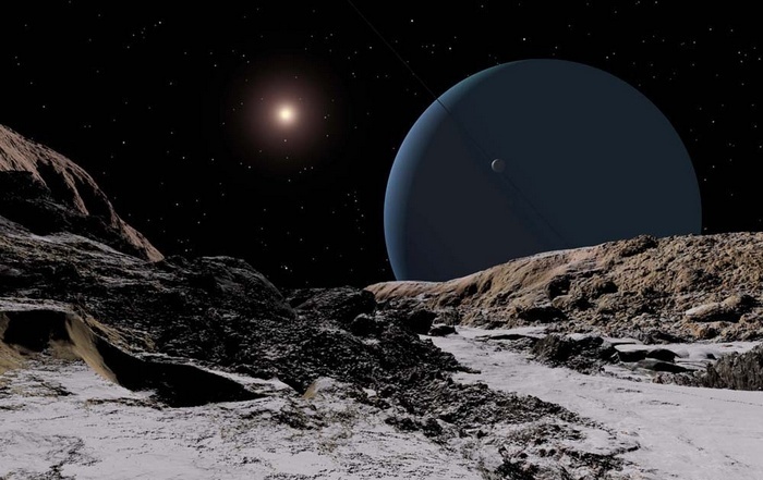 Но това огромно разстояние избледнява в сравнение с отдалечеността Нептун, който е „изхвърлен“ от светилото с 4,5 милиарда километра (30 пъти по-далеч от Земята). В този случай виждаме зората на Сателитът на Нептун – Тритон. Слънцето тук изглежда малко звездичка, още повече, че тя също е покрита от емисиите си прахови гейзери.
