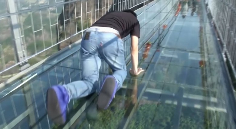 Припомнете си, че в Китай в края на миналата година най-много дълъг стъклен мост за туристи с дължина 488 метра и за тези, които са особено смели, по планината има стъклена пътека Тайханшан, чието покритие започва да се „напуква“ под краката смелчаци. И въпреки че това е просто изкуствено създаден ефект, като практика показва, за да преживеете това и да останете в същото време хладнокръвен е далеч от всеки турист.