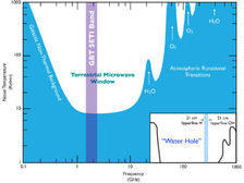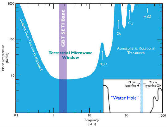 Честотният обхват, в който работят „ловци на извънземни умът “, включва така наречената” водна дупка “с честоти, характерно за излъчване на водородна и хидроксилна група (илюстрация Калифорнийския университет, Бъркли).