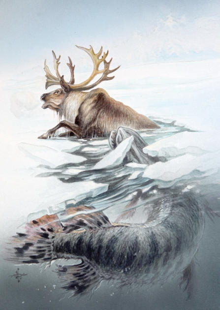 Легендата за канадския ескимос разказва колко гигантски рибата изяде двама рибари наведнъж. Случи се, когато трима мъже пресече голямо езеро при Саниньока. Двама седяха вързани каяки се помежду си, третият плуваше отделно и изведнъж се чу силен вик за помощ. Тази огромна риба нападна свързаните каяци и ги погълна. Ескимо осъзна, че спасяването на другарите не е успее и бързо изплува на брега. Чудовището тръгна след него. Така е състезаваше толкова бързо, че се движеше пред себе си и те се блъснаха каяк напред. Щом лодката докосна брега, мъж изскочи и избяга.