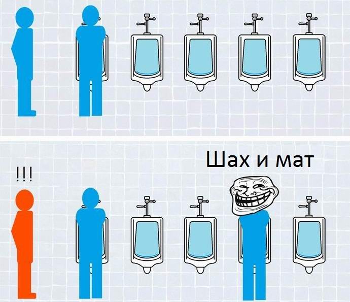 Математиците извършиха строги изчисления, в резултат на което установи, че най-изгодната позиция за справяне с малките нужди в обществена тоалетна е най-отдалеченият от писоара входна врата. Заемайки го, най-вероятно ще провокирате други мъже, които отиват до тоалетната, за да станат за писоари, разположен през един от заетите. Така между всички посетителите на тоалетната ще бъдат поне един празен писоар. Това ще позволи на всеки от мъжете не само да запази личните си пространство, но и да спазват правилата на “тоалетния етикет” според коя операция на всички писоари подред, както и мониторинг съседите и разговорите с тях са неприемливи.