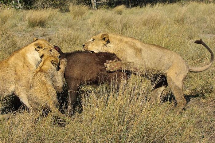 Въпреки това хищниците имат огромно предимство в това те безстрашен, ловува в стадо, което в същото време е много организирано и неуморен в постигането на основната си цел в живота – да получи месо за обяд. В същото време в повечето случаи лъвовете се опитват да се приберат отново от стадо биволи от най-немощните животни, и още по-добре – млад растеж.