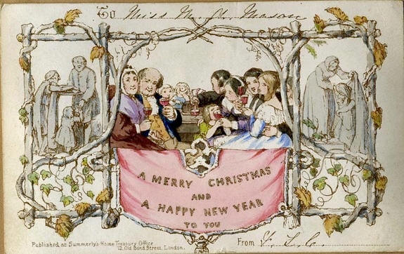 Оказва се, че първата серийна коледна картичка е била отпечатано в Лондон през 1843г. Обратно във викторианска Англия домашно ръчно написани коледни картички се радваха огромно популярност. Иноваторът от онова време, сър Хенри Коул, реши за опростяване на този процес с помощта на карта – запис. Възползвайте се нова технология за печат, Cole поръча художника Джон Horsley да проектира празнични поздрави и през 1843 г. освободен 1000 копия от него. След това Коул го поздрави семейство и приятели, а останалите карти продадени на цена един шилинг за всеки. През 1851 г. Коул играе важна роля в композирането Страхотна изложба в Лондон Хайд парк (сега Виктория и Алберта). Неговата пощенска картичка е призната за първата комерсиална Коледа пощенска картичка, днес 20 копия от които са запазени в библиотеки и архиви. И на 14 декември тази година синът му се продава на Търг във Великобритания на едно от редките, не боядисани копия на картата на Cole за 4200 евро. Картичката показва приятелско семейство, което събрахме се да отпразнуваме Коледа, публикувани там банер, който гласи: „Весела Коледа и Честита Нова година Вие “! Тази иновация беше бързо прихваната от САЩ, от още една ранна коледна картичка от колекцията Grossman, който е отпечатан във Филаделфия през 1850 г., също така представя витрини на пет семейства огнище и слугата, който поставя празничната трапеза. друг Викторианските серийни карти приличат повече на познати ни коледни картички, защото те обикновено изобразени снежни човеци, Дядо Коледа, червени чорапи за подаръци, венци от игли и набръчкани деца. Въпреки това, някои пощенски картички, направени във Книгата на Grossman “Коледни куриози”, модерен облик може да изглежда малко странно: Крампус се влачи и изпуска лоши деца в подземния свят, целуващи борови дървета, запалващи пура от коледното дърво Дядо Коледа, украсяващо миши дървета; котки, играе снежни топки. Картички с животни, действащи като хора все още можете да разберете, но как харесвате пощенската картичка с изображението на мъртва птица и надпис: „Може би поне твоята Коледа ще е повече радостен “?