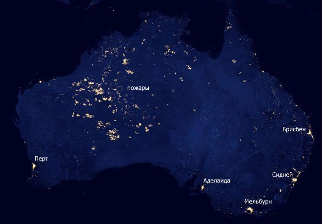 В четвъртък, 20 декември, НАСА публикува ново изображение на един от най-забележителните мистични генератори на пламък на континента – регион Западна Австралия. Изследователи от Националния американската космическа агенция обясни, че мястото на якри от светлина, видим при нощни снимки на отдалечени райони – това е невероятно огромни природни пожари, унищожаващи оскъдната растителност храст. Огромните размери на териториите, обхванати от учените на пламъците обяснено с факта, че данните за сложност, 22 дни през април и октомври на текущата година, когато сателитът Suomi NPC снима Австралия. Тоест пожари сравнително малки зони постоянно се движат по пясъчния пустини в централните и западните райони на страната, а сателитът на финалната снимка показа веднага всички области, които пламъкът обхвана по време на снимачния период.