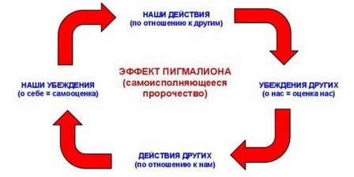 За съжаление, хората често дори не знаят как те използват самопророчество в своя вреда. Например, жена убеждава себе си (или майка й я е убеждавала в това по-рано) в това усилията й да отглежда деца, по-малко домакинство по-важно от това съпругът да прави пари. Естествено тя започва се държат в семейството като непълнолетен човек. съпруг човек създава впечатление, че съпругата му е нерешителна личност и слаби, на които не трябва да се вярва, за да решат най-важното семейство въпроси, особено по отношение на финансите. Той престава да се консултира с нея, което я засилва според мнението на нейното второстепенно. Всичко кръжи тя се затваря и нейните повтарящи се цикли само изострят ситуацията на тази жена, което често води до нейното пълно подаване мъж, когато тя започне да играе ролята на своеобразна прислужница в къщата, или да се разведе. Но всичко може да се промени към по-добро, ако знаете, как действа ефектът пигмалион!