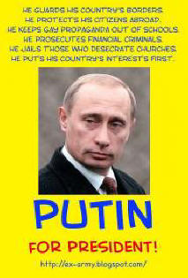 Надписите на плаката отгоре надолу: Той пази границите си държава; той защитава гражданите си в чужбина; той забранил в училищата гей пропаганда; той преследва финансови престъпници; той растенията в затворите на тези, които хулят в църкви; той поставя интересите на страната над техните собствени. Путин на президента!