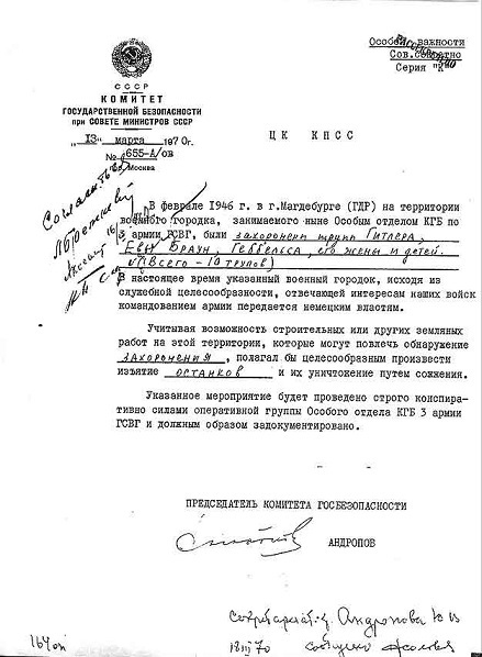През 1970 г. територията, окупирана от съветските войски градът в Магдебург е прехвърлен на властите на ГДР. Въпросът се появи отново за останките на фюрера и погребани с него (общо 10 трупа). В поход 1970 г. Председателят на КГБ Андропов изпраща нота до Брежнев, през които предложиха да отворят гроба, да унищожат останките от изгаряне. Вашата утвърдителна виза върху документ, различен от Брежнев остави Косигин и Подгорни. Операцията за унищожаване на останките получи името “Архив”.