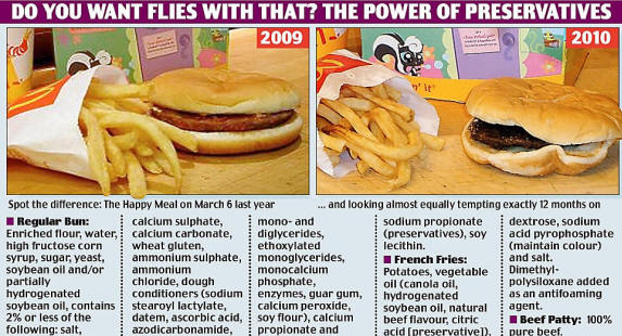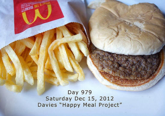 През 1996 г. консултант по здравословно хранене Карън Харахан започна експериментът: колко дълго, без разваляне, може да оцелее хамбургер от mcdonalds. Оказа се, че е на поне 12 години. През това време хамбургерът изобщо не беше лош В САЩ мнозина се втурнаха да повтарят този експеримент. Сред тях е фотографката Сали Дейвис. 15 декември я Бургерът навърши 979 дни – и той все още е добре. за снимката по-горе показва резултата от експеримента с Харахан – просто вляво купи хамбургер от Макдоналдс, вдясно – който е на 12 години. в продължение на този път продуктът не е изгнил, не е плесенял, а само е изсъхнал състоянието на подметката е състояние на кок, това на говеждо котлет. Харахан като здравият диетолог настоява за вечен хамбургер става, защото е натъпкана с консерванти и сол. Когато е в 2008 г., тези резултати се появиха, много американци се втурнаха провежда същия експеримент. Сред тях е фотограф от Ню Йорк Сали Дейвис. Тя дори усложни опита, като добави към хамбургер стандартна порция пържени картофи. Резултат от експеримента в Дейвис прави снимки всяка седмица и качва снимки на страницата си на трептене. 15 декември 2012 г. нейният хамбургер и торба с картофи навърши 979 дни и двата продукта все още са в перфектен ред! Няма следи от гниене или плесен върху тях, единствената промяна отвъд този път – те значително изсъхнаха, почти се превърнаха в камък: