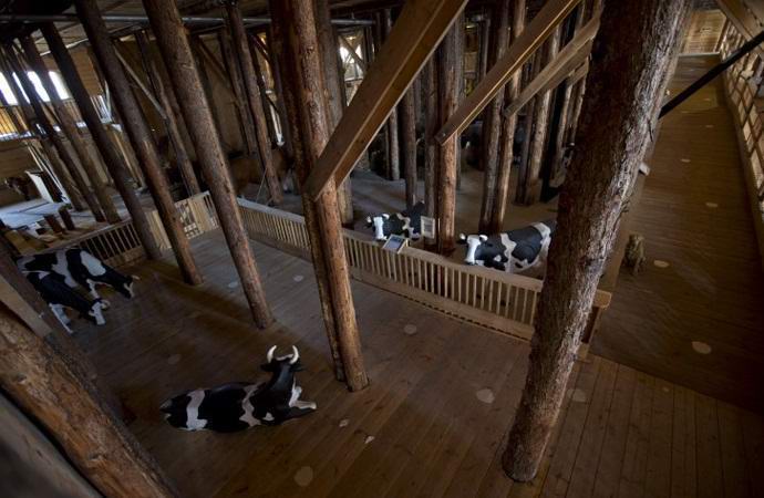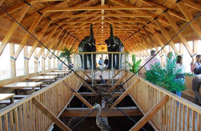 Дървеният гигант се вижда от много километри. От прозорците й пластмасови и гумени жирафи, слонове, крокодили надничат, хипопотами, крави, кенгурута и други животни. Станете истински животните са твърде скъпи, така че в случай на глобално наводнение дърводелец може да спаси само многото си домакинства домашни любимци: котки, кучета, зайци, папагали, гълъби (някой друг трябва да донесат в човката масло, което да уведомява хората за края Flood).