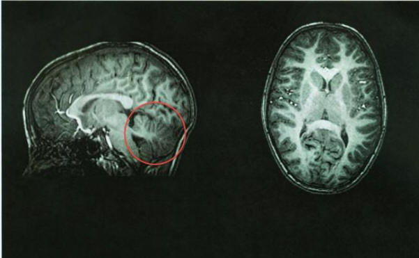 След томография лекарите веднага идентифицират източника на проблема – неговия малкия мозък отсъстваше. Пространството, където трябва да е празно. това мозъчната област се напълни с цереброспинална течност, осигурява защита срещу болестта. Мозъкът отнема около 10 процента от общ обем на мозъка, но съдържа 50 процента от невроните.