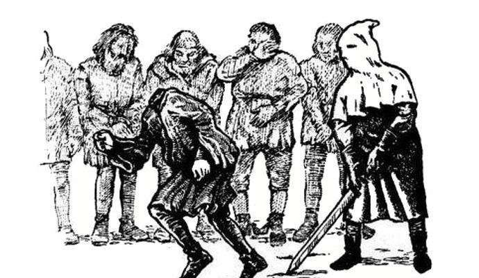 Фон Шаунбург веднага постави крачетата войници в редица, измерени големи стъпки необходимо разстояние между тях, след което се придвижва напред договореното разстояние сам, коленичи и се пресече три пъти. Когато мечът на палача свистеше във въздуха, русата глава на бунтовника търкаля се надолу към земята. Присъстващите замръзнаха. Неочаквано тяло екзекутираният скочи на крака и за ужас на царя с придворните, се втурна към Ландскнехт, пръскайки кръв от гърлото. Минавайки последно осъден, тоест като е направил повече от тридесет и две стъпки, мъртвецът спря, гърчеше конвулсивно и се срина на земята, след което той вече не показва признаци на живот.