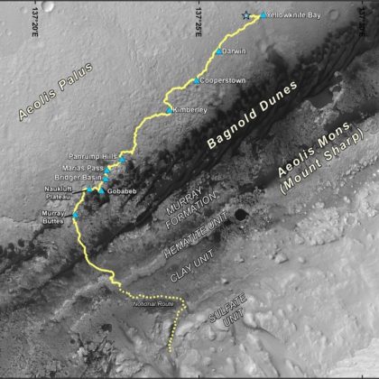 Маршрут на пътуване с любопитство на роувър. Изминат и планиран път.
