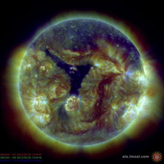 Снимка от отворени източници Изображение на Слънцето, 13:44 от GMT 25 юни 2013 г. © SDO | НАСА От Коронал дупките са области, в които магнитното поле е отворено, и слънчевият вятър може спокойно да се влива в космическото пространство, тогава магнитните бури могат да започнат на Земята. Според изчисленията на геофизиците НАСА, това ще се случи на 29-30 юни. Въздействието ще докосне и преди общи полюси, където трябва да се очакват полярни светлини.