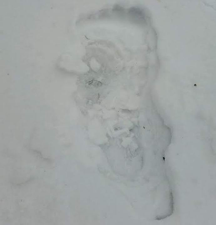 Веднъж на улицата близо до къщата си, въоръжен с лов пушка, Кристофър забеляза в снега големи следи от боси крака, подобни върху човека. Според Бауер дължината на всяка писта е била около четиридесет и пет сантиметра и ширина около двадесет. Разстоянието между пистите беше повече от един метър и половина, от които Американецът заключи, че йети се движи с пълна скорост. Без да мисля два пъти ловецът се отправи по пътеката, образувана от тези стъпки, като е готов във всеки момент да настигне легендарната реликва хоминид и го застреляй.